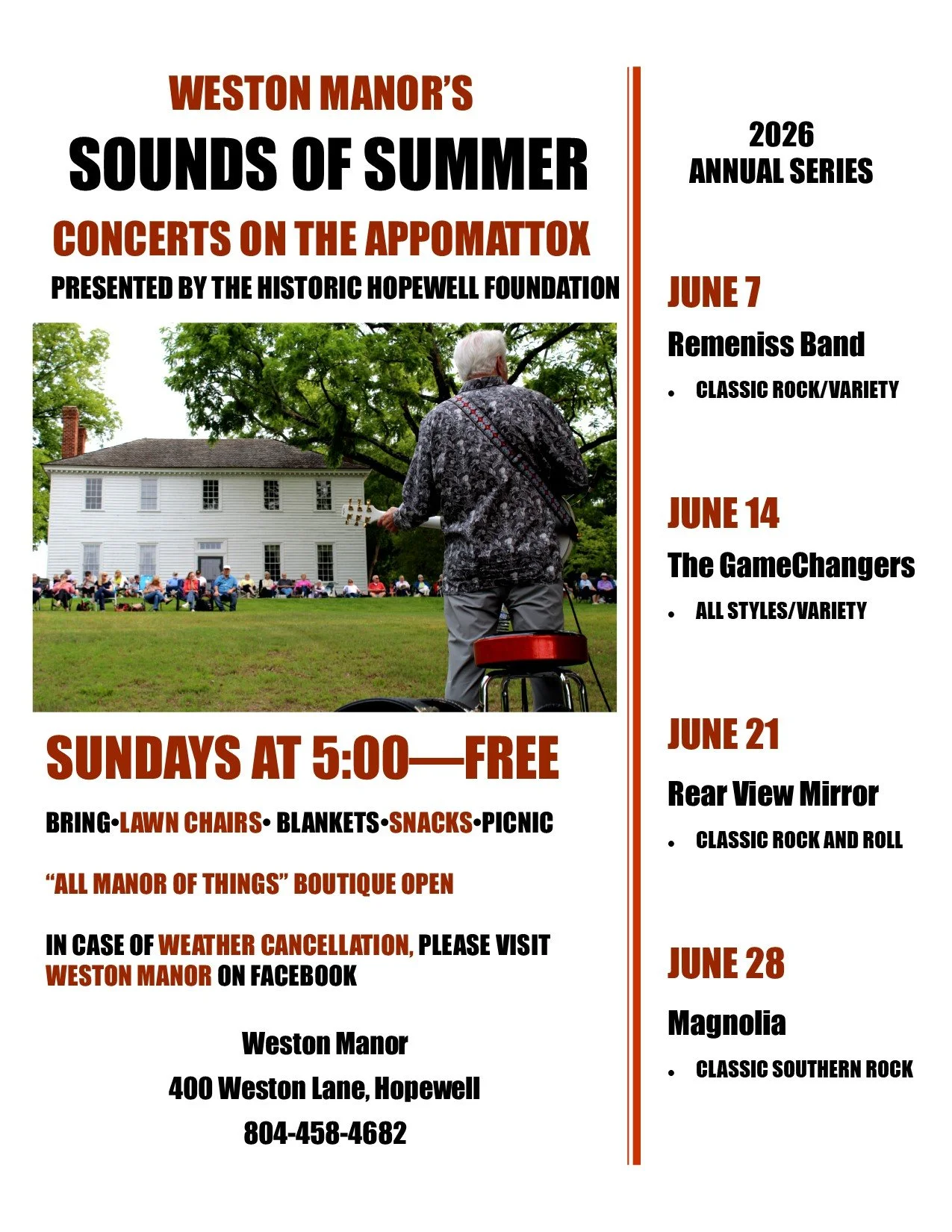 Come to Weston Manor to enjoy FREE concerts on the Appomattox River. Bring your own blankets, lawn chairs, and picnic while enjoying a variety of different bands!